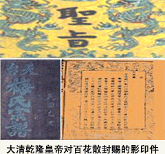 據梅氏族譜記載,明末清初年間天臺縣深山有梅氏長者為當地草藥郎中,在深山采藥時,偶然進入人跡罕至的深澗,澗中飛瀑從天而降,懸崖峭壁環(huán)繞,古樹參天,奇花異草,蝶舞蜂飛,巖壁長滿靈蘭(鐵皮石斛仙人草)。深澗山洞中,有一石棺,棺中著明代服飾的白須老者栩栩如生,衣著完好;石桌有明朝正德年間治病強身《百花散》手抄醫書及白絹一幅,上有消化道腸胃、鼓漲病(肝腹水)、風濕關節(jié)等疾病配制方法。先人獲此神書神方,后依方所示,采澗中峭壁上之靈蘭、三七、猴頭菇和麝香等奇花異珍配制成不同系列的《百花散》,治療山民常見的消化道腸胃疾病、鼓漲病(肝腹水)、風濕關節(jié)疾病有奇效。山民食之,有病治病,無病健身。當地山民多長壽,童顏鶴發(fā)、身體強健的百歲老人隨處可見,均得益于神方《百花散》。當地民眾口碑相傳,美譽百花散為'神藥'、'藥王'。先人由此名聲大振,驚動大清朝庭,乾隆年間,皇帝多次下旨招先祖入朝并封賜。