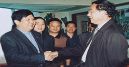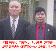 梅安富先生軍人出身(曾經在中國馬蘭核試驗基地工作十多年,為核武器發(fā)展做出了卓越貢獻、被評為八級軍殘)、高級經濟師、中共優(yōu)秀黨員、天臺山人氏。現任中共鄭州臺州商會支部委員會書記、常務副會長兼秘書長、河南省保健品協會副會長、全國政協副主席、中共中央委員、中國殘聯主席鄧樸方先生與鄭州臺州商會支部書記兼秘書長、《百花散》傳人梅安富先生親切交談鄭州市腫瘤康復協會名譽會長。2005年5月,作為臺州古代中醫秘方梅氏《百花散》